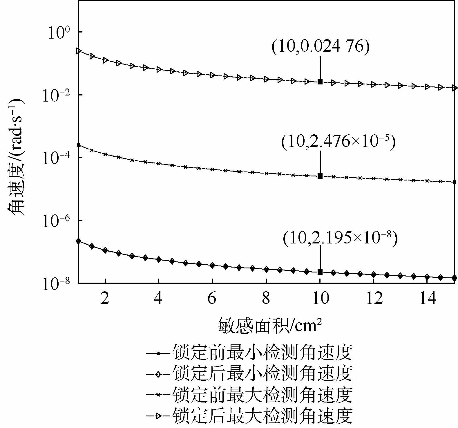 外界角速度输入时,薄膜幅值将被调制,当调制量恰与测量元件能检测最小薄膜位移的精度相等时,对应的角速度值为陀螺的最小检测角速度。受限于目前检测薄膜幅值的超导量子干涉仪检测精度仅为10-15 m,在敏感面积10 cm2时超流体陀螺的最小检测角速度为2.195×10-8 rad/s。此外随着敏感面积的增大,陀螺的最大检测角速度变小,限制超流体陀螺使用的关键是如何扩展其角速度测量量程上限,陀螺做的越小,其敏感面积就越小,对应可实现的检测角速度越大。 在敏感面积为10 cm2的情况下,幅值锁定前后的最大检测角速度由2.476×10-5 rad/s增大到2.476×10-2 rad/s,可见幅值锁定控制较好地实现了陀螺的量程扩展。