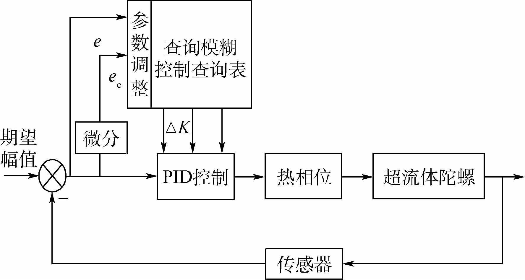 文献[8]对双弱连接超流体陀螺干涉仪进行了原理推导和相关实验,从薄膜幅值中提取出地球自转角速度分量,从而提出将其发展为新型陀螺的构想;文献[9-10]的研究表明,超流体陀螺可高灵敏、高精度感知角速度,其可检测角速度范围有限,但未提出可行的量程扩展方案;文献[11-12]提出热像移辅助方法来扩大超流体陀螺的量程,但未考虑系统惯性延迟的问题,从而不可避免地制约超流体陀螺的敏感精度和动态特性。文献[13]虽然考虑了一阶惯性滞后,为热像移辅助回路设计了简单可行的比例(P)控制器,但系统的动态性能和控制精度有待进一步提高。此外,关于模糊控制系统优化设计方面,文献[14]提出采用粒子群算法来优化模糊控制规则,算法简单且计算方便,但容易陷入局部最优,导致结果不理想。文献[15]提出使用BP神经网络优化模糊隶属函数,该优化算法具有自适应自学习的能力,但其优化结果对训练样本依赖大且学习过程较复杂,工程应用较难实现。