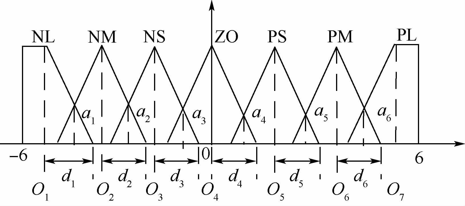 输入输出在论域的隶属函数分布通常为如图 5所示的典型等腰三角形隶属函数[19]。图 5中:O1、O2、O3、O4、O5、O6、O7分别为隶属函数NL(负大)、NM(负中)、NS(负小)、ZO(零)、PS(正小)、PM(正中)、PL(正大)的中心点;d1、d2、d3、d4、d5、d6分别为各隶属函数的中心点到右边界点的宽度,称为隶属函数的右半宽度;a1、a2、a3、a4、a5、a6为相邻隶属函数交点的纵坐标,即重叠因子。