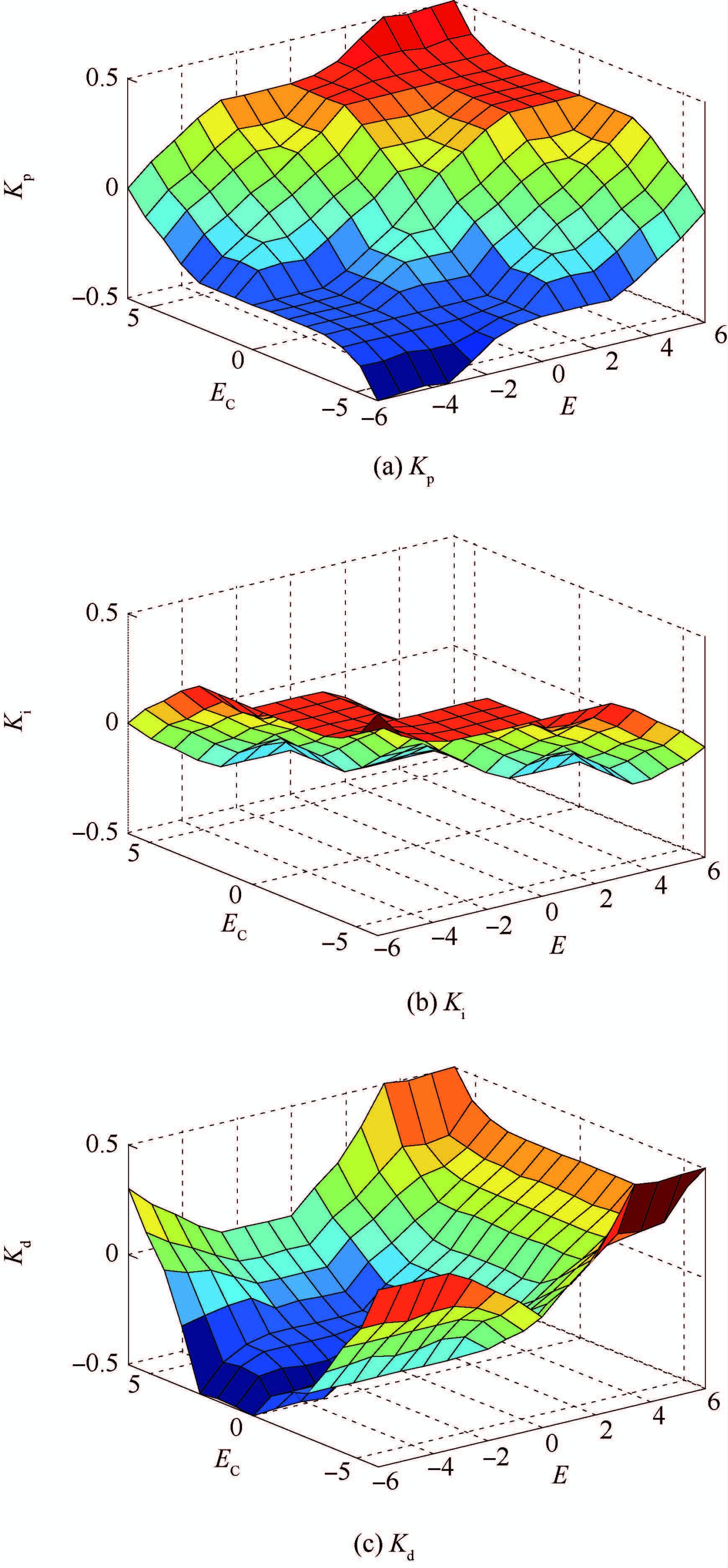 通过模糊推理特性曲面可以直观分析出控制系统输入输出特性,曲面上某一点的三轴坐标表征着相应的控制参数。其中水平坐标对应不同的E、EE值;竖直坐标对应不同E、EE取值时,模糊推理系统的输出控制量Kp、Ki、Kd,推理特性曲面较为平滑,表征控制较为理想。