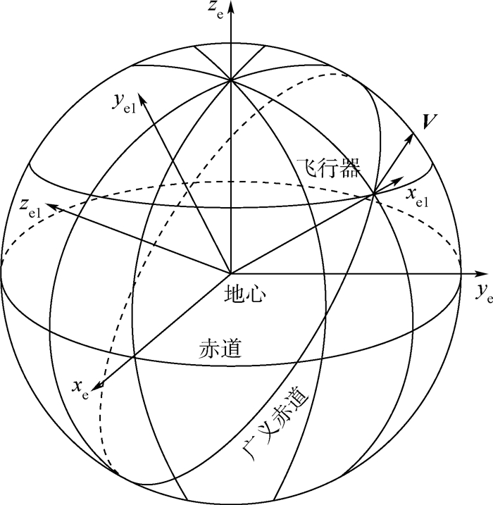 1 数学模型 1.1 坐标系定义为便于理论分析,假设地球为静止正圆球体,并引入广义赤道,如图 1所示,飞行器在广义赤道附近运动。当地地心坐标系Se1如图 1所示,坐标原点位于地心,xe1由地心指向飞行器;ye1在由xe1与速度矢量V构成的平面内,且与V同一侧;ze1由右手定则确定。地心赤道旋转坐标系Se坐标原点同样为地心,ze由地心指向北极,xe处在赤道平面内指向本初子午线,ye由右手定则确定。两者之间的坐标转换关系为
