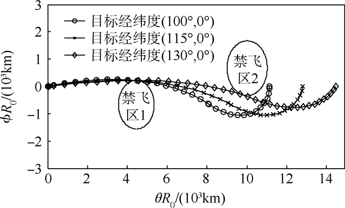 4 基于解析解的快速弹道规划将本文解析解应用于滑翔段机动弹道规划。滑翔段初始参数与表 1相同,终端条件和过程约束见表 3,禁飞区设置见表 4。表 3中,