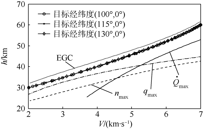 图 11~图 16给出了滑翔段机动弹道的规划结果,图 16中的EGC表示由平衡滑翔条件获得的滑翔弹道高度上界。由图 11和图 12可以看出,基于解析解规划获得的攻角α曲线和倾侧角曲线均非常光滑,并且可通过分段实现倾侧角反转。由图 13和图 14可以看出,规划弹道的终端高度和速度满足要求。由图 15可以看出,规划的滑翔段机动弹道符合禁飞区约束要求和终端经纬度要求。由图 16可以看出,规划的滑翔弹道满足最大热流密度、最大动压和最大过载等约束,并且不同任务弹道在再入走廊中几乎完全重合。