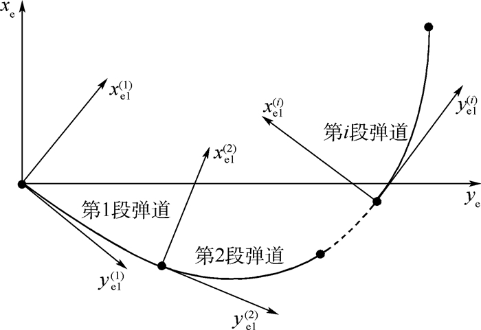 为了在弹道偏角解析求解时sin ø和cos ψ能够进行线性化,采用如图 2所示的分段求解策略,并且在每一段弹道的起始点均定义广义赤道坐标系(图 2中的x(i)e1和y(i)e1为第i段弹道起点的当地地心坐标系坐标轴),从而使得
