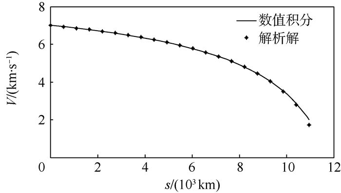 3 解析解精度校验 3.1 解析解与数值积分的精度对比为了检验本文解析解的精度,采用CAV-H为飞行器模型[18],对滑翔段弹道进行仿真计算。仿真参数设置如表 1所示。图 4~图 6分别给出了速度、纵向弹道和横向弹道的解析解与数值解的对比。可以看出,本文解析解具有较高的求解精度,其中纵向弹道的解析解与数值解几乎完全重合,而横向弹道和速度的解析解与数值解存在较小的偏差,并且随着射程的增大而增大。