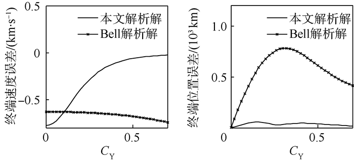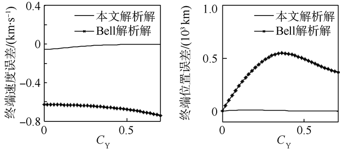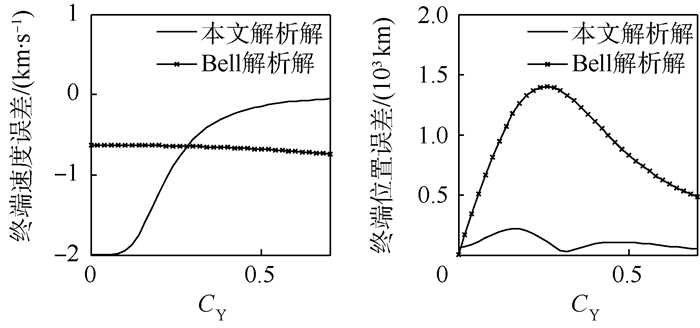 将本文解析解与Bell解析解的精度进行对比。仿真的初始参数与表 1相同,终端速度设定为2 000 m/s,横向升力系数CY从0逐渐增加到0.7,并采用分段逐步求解的方法来预测终端状态,得到的结果如图 7~图 9所示。