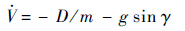 式中:h、s、θ、ø、ψ和V分别为当地地心坐标系下的高度、射程、经度、纬度、弹道偏角和飞行器与地球的相对速度;γ为弹道倾角;r为地心与飞行器的距离,r=R0+h,R0为地球半径;m为飞行器的质量;σ为倾侧角;g为当地重力加速度,g=μ/r2,μ为地球的重力常数;L和D分别为升力及阻力,表达式为