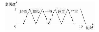 3.2.1 模糊集和隶属度函数的设计根据无人机受损程度将受损度划分为10个等级,即论域为[1, 10],在此论域的基础上定义5个模糊集,分别为受损严重、较重、一般、较轻、轻微。5个模糊集的隶属函数设计如图 11所示。图中实线和虚线分别代表了不同模糊子集的隶属度函数,模糊子集在对应区间的隶属度为1,与相邻区间的隶属度为一条斜线,底端与相邻区间中点连接,顶端与两区间交点连接。这样定义好处是论域上任意一点只隶属于一个模糊子集。
