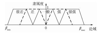 根据侧滑角的大小以及威胁位置建立无人机机动潜力的模糊集。论域为无人机侧滑角的范围[βmin,βmax],在论域的基础上定义5个模糊集,分别为很差、差、一般、强、很强。隶属度函数设计与之前类似,如图 13所示。