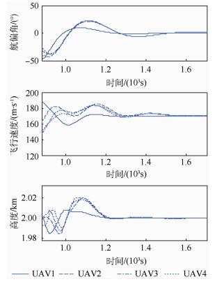 可以看出,4架无人机的速度、高度以及偏航角在编队算法的作用下迅速收敛并保持稳定,以横一队形编队飞行。