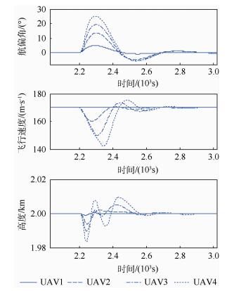 从图 16和图 17中可以看出,横一编队为了躲避障碍,通过速度以及航向的调节依次绕过障碍,形成一个最利于通过障碍的纵一队形,并且各飞机之间保持一个相对安全距离,安全绕过障碍后又重新形成横一队形。