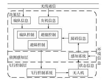 整个系统框图分为3层,分别为决策层、侦测感知层和飞行控制层。无人机通过无线通信获得编队信息以及编队中其他飞机信息,通过感知系统获得环境信息进一步获得是否有障碍信息。根据获得的信息进行编队控制、避障控制以及避撞控制,得出相应控制量,将得出的控制量传到飞行控制系统也就是自动驾驶仪,然后通过飞行控制系统完成对无人机的控制。