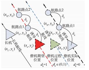 诱导航线产生过程如图 6所示。由式(3)可知,诱导航线的位置主要由参数dk决定,dk为一个从0到1的变量,根据飞机的滚转能力设定。当dk=0时,以僚机实际位置为基准、以长机飞行方向为航向产生诱导航线;当dk=1时,以僚机期望位置为基准、以长机飞行方向为航向产生诱导航线。在飞行过程中不断改变dk,使诱导航线逐渐接近僚机的期望位置,僚机通过跟随诱导航线逐渐从实际位置到期望位置移动,最终使得无人机到达期望的位置。