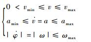 式中:vmin和vmax分别为飞机最小和最大速度限制;amin和amax分别为飞机最小和最大加速度限制;a为飞机加速度; ω为飞机偏航角速度; ωmax为飞机最大偏航角速度。