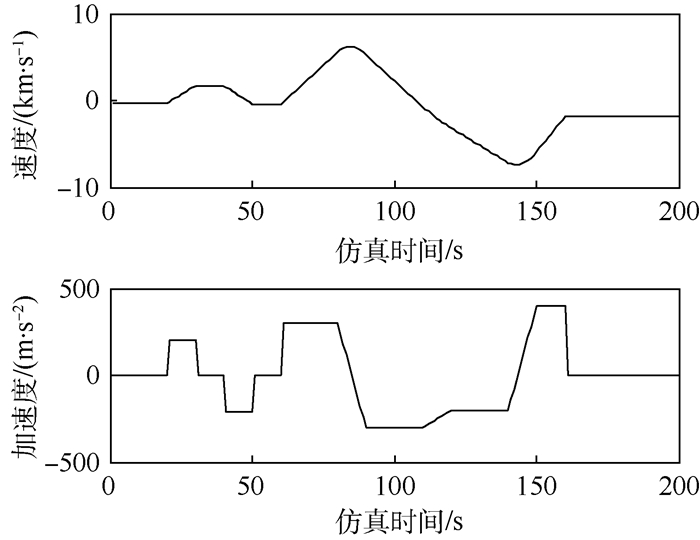 x轴,即高度方向,目标做强机动运动,目标的初始位置、速度、加速度和加加速度分别为10 000 m、-300 m/s、0 m/s2和0 m/s3。0~20 s,目标匀速运动,20~30 s、30~40 s分别做加速度为150 m/s2、-120 m/s2的匀加速度运动,40~60 s匀速运动,60~80 s做加速度为300 m/s2的匀加速度运动,80~90 s做加加速度为-60 m/s3的匀加加速度运动,90~110 s之间做20 s的匀加速运动,110~120 s做10 m/s3的匀加加速度运动,120~140 s匀加速运动,之后10 s进行60 m/s3的匀加加速度运动,150~160 s做匀加速运动,160~200 s保持匀速运动。