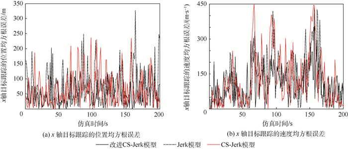 表 1中数据表明,相比Jerk模型,x轴方向上改进CS-Jerk模型对位置、速度和加速度估计的平均误差分别减小35.95%、9.00%和10.97%,y轴方向上位置、速度和加速度估计的平均误差分别减小24.18%、70.46%和70.67%;而相比CS-Jerk模型,x轴方向上位置、速度和加速度估计的平均误差分别减小28.75%、13.79%和9.54%,y轴方向上位置、速度和加速度估计的平均误差分别减小24.05%、63.61%和68.19%。从算法的平均耗时来看,改进CS-Jerk模型耗时最长,但仅比CS-Jerk模型和Jerk模型分别增加了2.35%和6.41%,因此以时间为代价换取跟踪精度的提高是可取的。