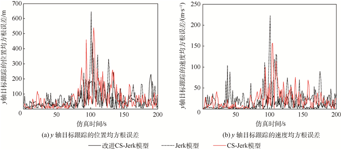 图 4和图 5表明,在x轴方向上,与Jerk模型和CS-Jerk模型相比,改进CS-Jerk模型算法减小了对目标位置和速度的跟踪误差,且对0~60 s、160~200 s目标弱机动和60~160 s目标强机动,位置的跟踪误差相差不大,而3种算法在60~160 s的速度跟踪误差均高于0~60 s、160~200 s;y轴方向上目标匀速运动,由于x轴方向的耦合作用,3种算法在60~160 s位置和速度的跟踪误差均比其他时刻要高,而改进CS-Jerk模型的跟踪误差显然更低。
