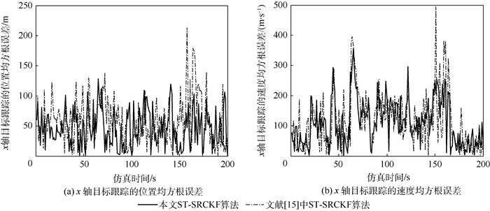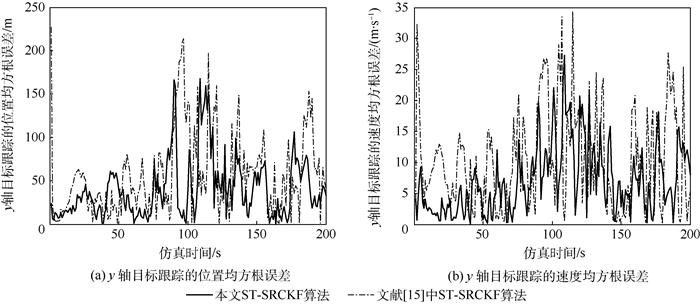 仿真2 在仿真1的基础上,根据改进的CS-Jerk模型对系统建模,采用本文ST-SRCKF算法实现滤波计算,与文献[15]中ST-SRCKF算法的滤波结果进行对比。x、y轴方向上目标位置和速度的均方根误差分别如图 6和图 7所示,表 2给出了目标状态的平均误差。