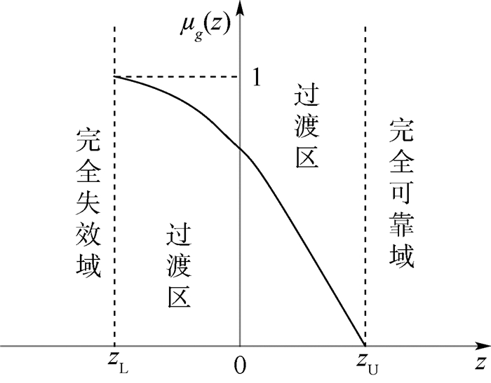 通过将原有的确定失效判据进行拓展,结合工程经验和专家意见得到一个表示产品从完全失效到完全完好的区间[zL,zU],描述事件状态程度隶属函数μg(z)可以用来表示这一过渡情况,其数值越大则产品失效的倾向越大,数值越小,失效的倾向越小,如图 2所示。