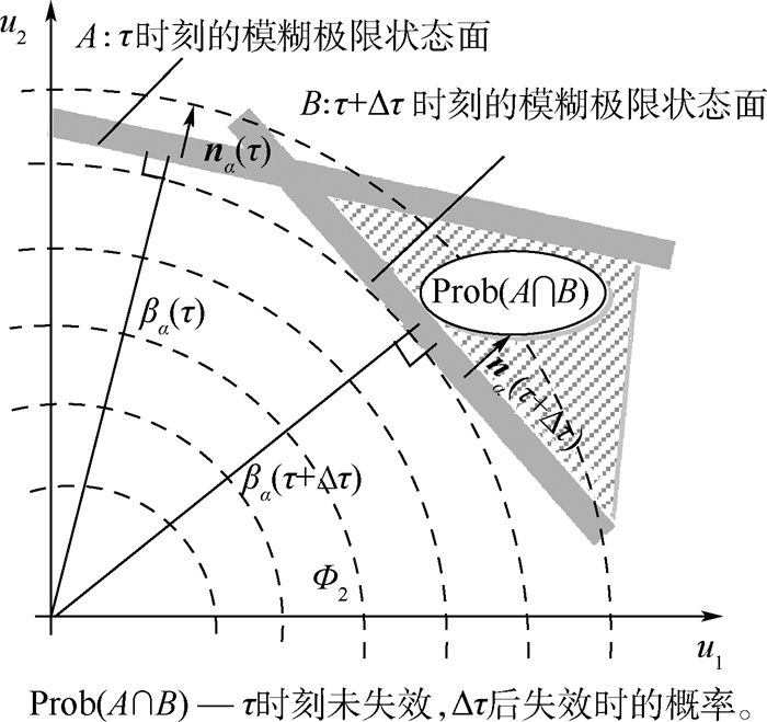 式中:nα(τ)和nα(τ+Δτ)分别为α水平下τ和τ+Δτ时刻下二维标准正态空间中极限状态面的单位外法向量,具体见图 3所示。