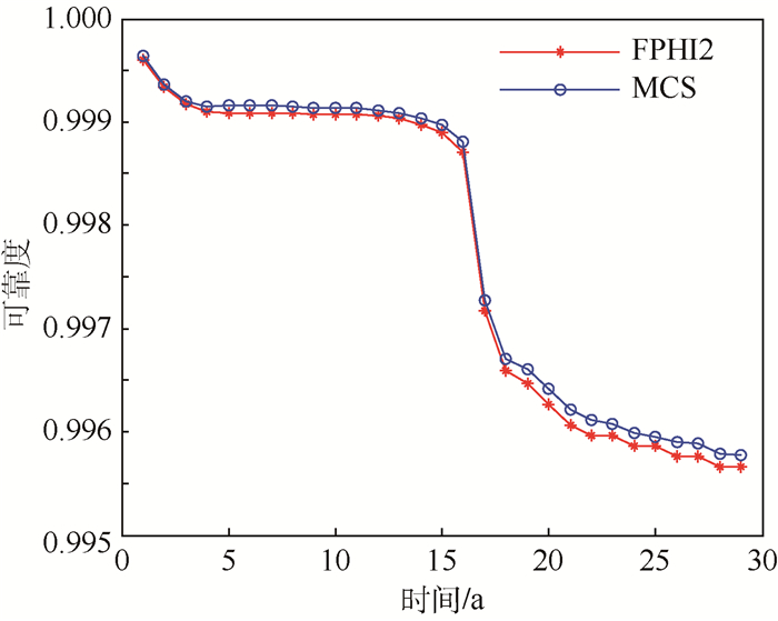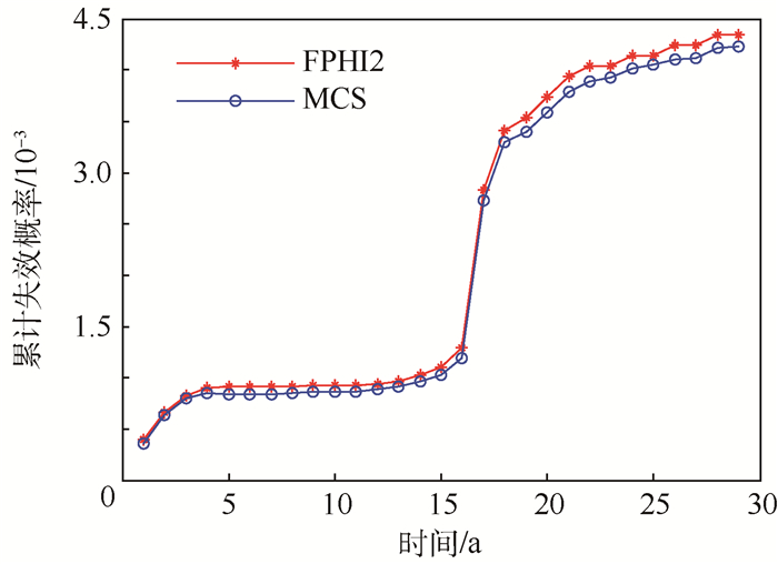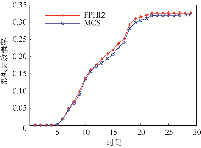 从图 4中可以看出采用本文提出的模糊时变可靠性建模及可靠度求解方法得到的累积失效概率随时间呈上升趋势,在t≤5时可靠度很高,之后的5<t≤20时,累积失效概率随时间增长较快,达到0.32,最后的时间内趋于平缓,这是符合实际的。另外FPHI2和蒙特卡罗仿真(Monte Carlo Simulation,MCS)两条曲线贴合程度较高,其相对误差最大不超过10%,可见本文中的方法是相对准确的。