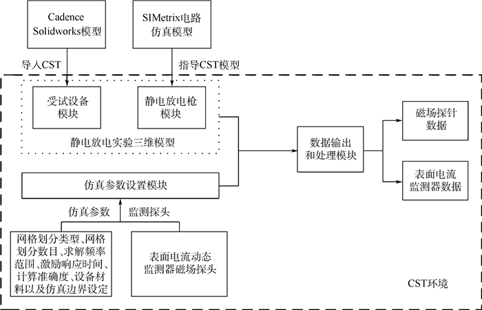 1 仿真测试平台概述静电损伤仿真测试平台主要由四部分构成,分别是静电放电枪模块、受试设备模块、仿真参数设置模块以及数据输出和处理模块,这四部分在基于CST的仿真测试平台上实现,它们之间的关系如图 1所示。