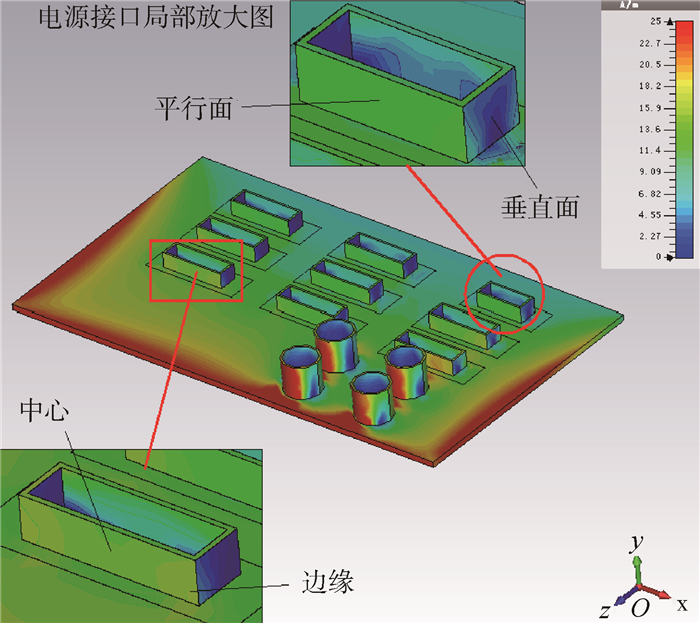 3) 另外通过图 10中电源接口的局部图可以看出,与放电侧板平行面的表面电流峰值可达到15 A/m,而垂直于放电侧板平面的表面电流峰值只有8 A/m,平行面远远大于垂直面。由此可以推断出表面电流传播具有方向性,这一点可以为后续实际测量表面电流传播途径以及定位静电放电点提供依据。