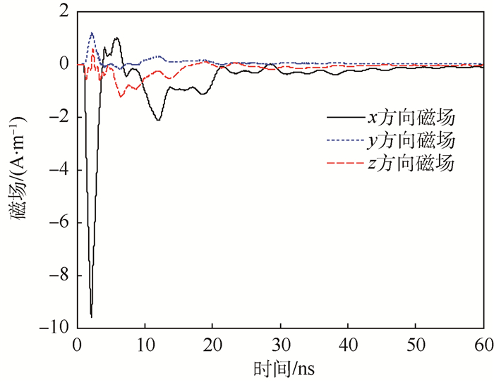 3.2.2 辐射干扰分析由于静电放电电流在短时间内产生了一个非常强烈的尖峰,根据静电放电辐射场公式[15]可以断定其产生的磁场脉冲场也具有尖峰,而这一尖峰很有可能会在设备线缆上耦合出电流。为了验证这一说法,结合图 10的坐标体系,在电源接口上端放置磁场探头,得到x、y和z方向的磁场如图 11所示。
