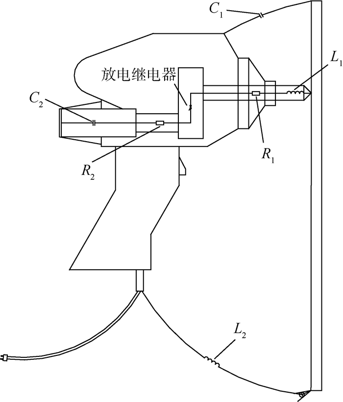 结合前人的研究基础,可以得到静电放电枪对金属板放电的实物示意图如图 2所示,图中所涉及的电路元件包括充放电电容C2、放电电阻R2、放电枪机壳和接地板分布电容C1、放电头电感L1、放电头电阻R1、接地线电感L2。