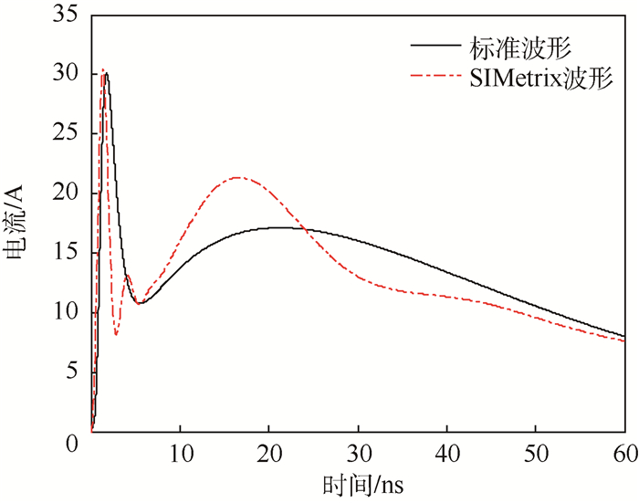 由GB/T 17626.2—2006可知,接触静电放电电压分为2、4、6和8 kV 4个等级,本文以8 kV放电电压为例进行仿真。通过SIMetrix软件可以得到静电放电的时域放电波形与GB/T 17626.2—2006标准波形对比如图 4所示,具体参数对比如表 2所示,可以看出仿真波形满足标准要求。通过此种方式,本文验证了静电放电枪对金属板放电电路模型的正确性。