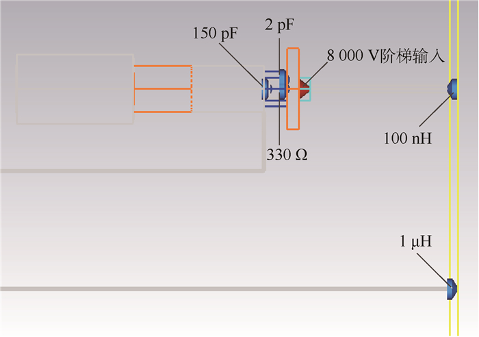 依据密苏里大学电磁兼容实验室的Pommerenke教授的研究成果,初始电压Vs的电容通过开关放电体现在负载上的电流和电压与具有Vs幅值的阶梯输出电压与初始电压为0的电容相互作用体现在负载上的电流和电压数值相同[11]。在此结论的基础之上,利用SIMetrix软件,将图 2对应的等效Spice电路图绘制出来,其基本形式如图 3所示,图中的各器件参数如表 1所示。