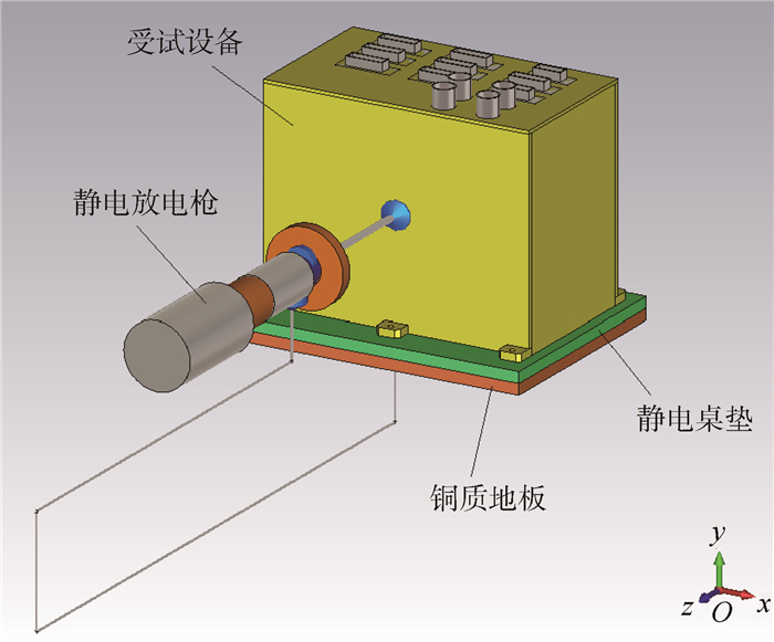 3.1 设备静电放电实验模型构建结合前人利用静电放电枪模型对手机进行静电放电仿真的研究[14],此设备8 kV接触放电仿真的模型如图 8所示,模型中主要包括静电放电枪、受试设备(铝壳)、静电桌垫(泡沫塑料材质)以及铜质地板。