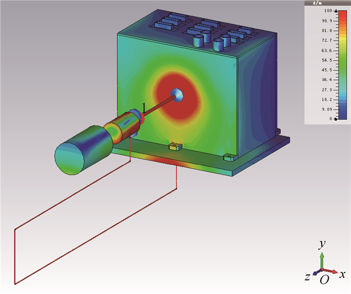 模型仿真参数模块设置为频率0~500 MHz、网格划分类型为六面体、计算准确度设定为-40 dB、网格划分数目设定为20,采样时间间隔为1 ns,模型设定的监测参数为磁场探头以及仪器表面电流的分布数值,图 9中展示了仿真模型表面电流的最大值分布情况。