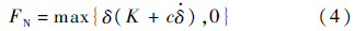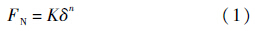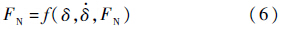 当物体间接触或碰撞时,若考虑物体的局部变形,则一个物体会局部嵌入到另一个物体中,其法向嵌入量用δ表示,如图 1所示.用Hertz接触模型,法向接触力FN可表示[7]为