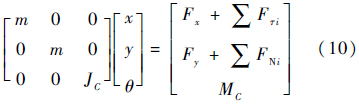 但是,当$\dot g$τi=0时,摩擦力不仅与状态变量有关,还与广义加速度$\ddot x$、$\ddot y$、$\ddot \theta $有关.此时,方程式(10)等号右端的摩擦力也与广义加速度有关,这给数值求解带来了一定的困难.