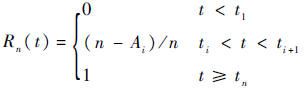 由结论 2可知寿命试验中不同时刻产品可靠度服从的分布。在有试件中途撤离时,由于无法得知这些试件将在何时故障而无法直接使用该结论,此时需假设中途撤离试件将等可能地在其撤离后的试件故障之间发生故障,则可对真实故障试件在所有试件中的故障序号的期望(即平均秩次Ai)进行计算,进而使用平均秩次Ai作为β分布法中的序号,即:对n个寿命独立同分布的产品进行寿命试验,则第i个产品故障时(此时的故障时间和撤离时间的共同排序号为j)产品的可靠度服从分布β(n-Ai+1,Ai)。直接通过求期望计算平均秩次Ai比较复杂,可选择通过递推公式计算: