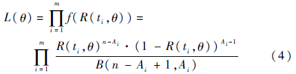 认为对应概率密度较大的可靠度估计值更合理,用该概率密度f(R(ti,θ))的大小评价该试件故障时可靠度估计值的合理程度,以各个试件故障时的f(R(ti,θ))的乘积评价估计结果对整组数据估计的合理程度,由此得到β似然函数为