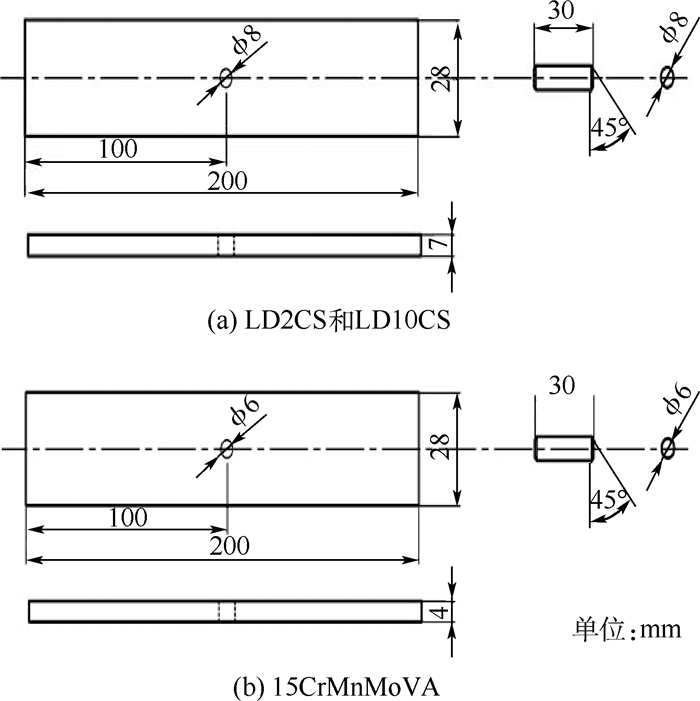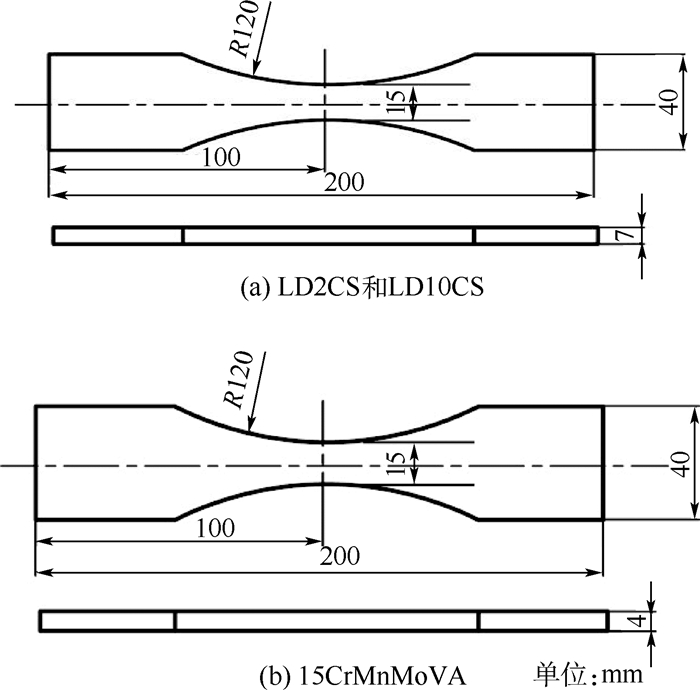疲劳试验所用材料为LD2CS、LD10CS和15CrMnMoVA,包括光滑和含中心圆孔2种试样形式,其中光滑试样几何尺寸如图 1所示,中心圆孔试样几何尺寸如图 2所示。