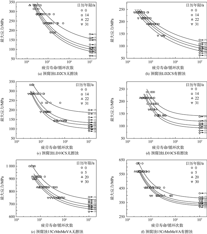 从图 4(a)~图 4(f)中可以看出,预腐蚀后3种金属材料在无擦蚀和有擦蚀条件下的疲劳性能均随着日历年限的增加而下降。