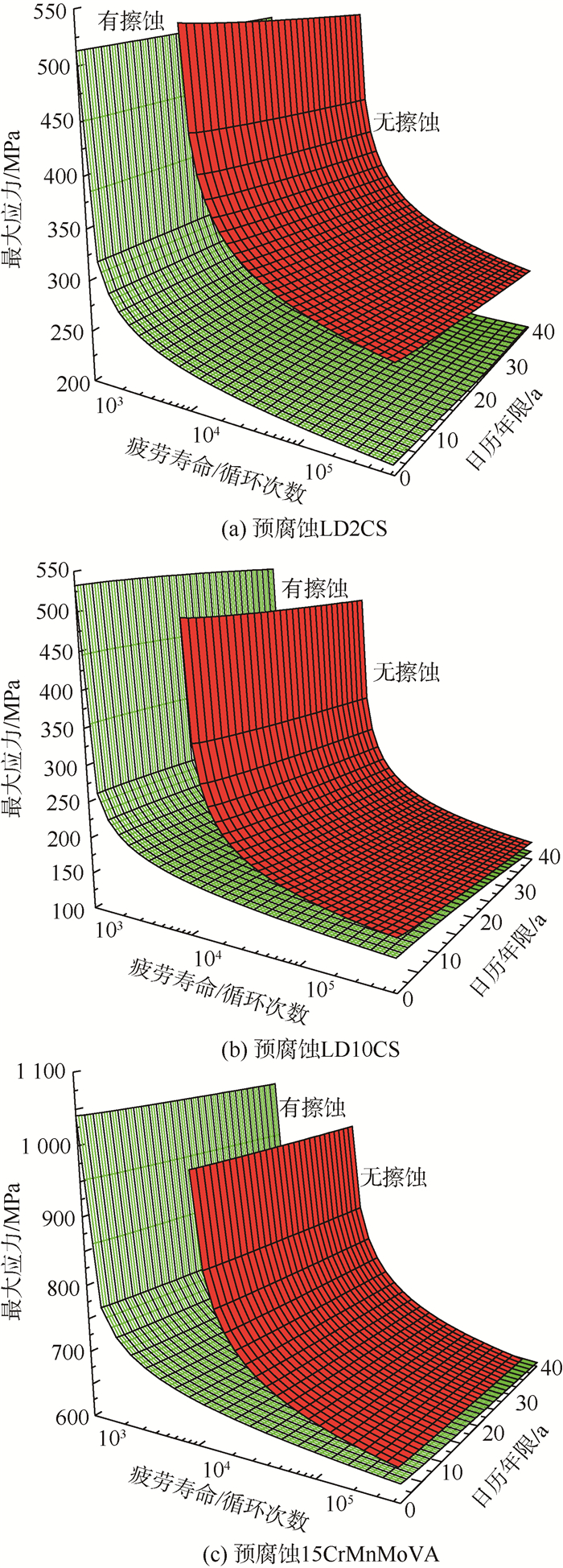 2) 3种预腐蚀金属材料无擦蚀和有擦蚀的疲劳寿命随着预腐蚀年限的增加而下降,在相同应力水平与预腐蚀年限下,预腐蚀材料无擦蚀的疲劳寿命均长于有擦蚀疲劳寿命。