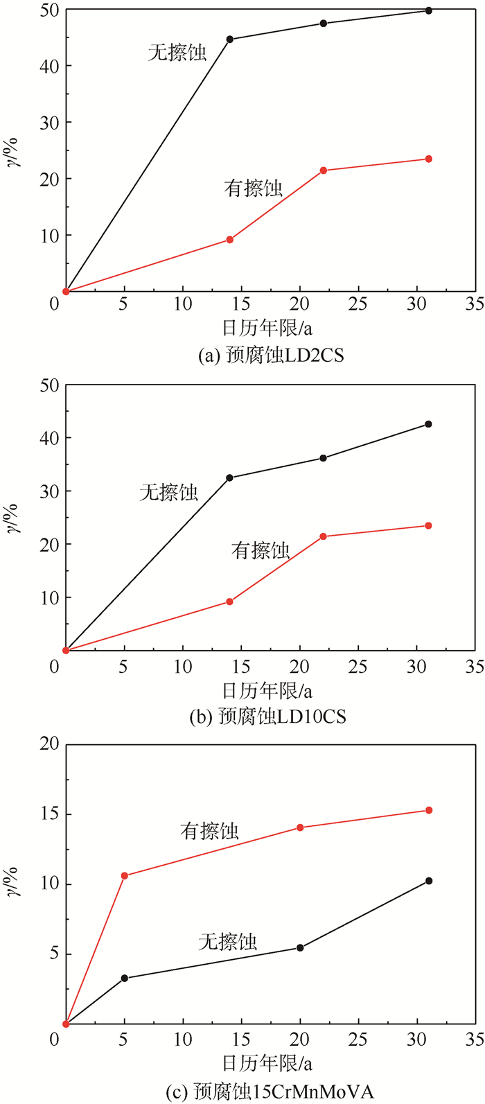 图 6(a)~图 6(c)分别为预腐蚀后LD2CS、LD10CS和15CrMnMoVA材料无擦蚀和有擦蚀的疲劳极限对比图,从图中可以看出,预腐蚀后3种材料无擦蚀和有擦蚀下的疲劳极限下降率γ均随着日历年限的增加而增大,说明预腐蚀疲劳极限均随着腐蚀时间的增加而降低。从图 6(a)和图 6(b)中可以看出,LD2CS和LD10CS 2种铝合金材料在预腐蚀14 a、22 a和31 a后的无擦蚀疲劳极限下降率分别为:44.6%、47.5%、49.7%和32.5%、36.2%、42.6%,而其在预腐蚀相同年限下的有擦蚀疲劳极限下降率为:9.2%、21.4%、23.5%和19.6%、21.7%、34.1%;由此可看出,预腐蚀铝合金材料无擦蚀疲劳极限下降率均高于有擦蚀疲劳极限,即预腐蚀环境下擦蚀减小了铝合金材料预腐蚀疲劳极限下降趋势。由图 6(c)可以看出,15CrMnMoVA合金钢材料在预腐蚀5 a、20 a和30 a后的无擦蚀疲劳极限下降率分别为3.3%、5.5%和10.3,低于相同预腐蚀时间下有擦蚀疲劳极限下降率(10.6%、14.1%和15.3%),因此,擦蚀会加剧预腐蚀合金钢材料疲劳极限下降。
