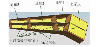1 燃油实体模型的建立油箱物理模型由蒙皮、隔板等结构构成(见图 1),该物理模型即油箱的空腔模型。其内部还有管路、阀和泵等结构,在计算燃油体积时,采用包络实体顺序剔除法对这些内部结构的体积给予非线性扣除,把剩下可以储存燃油的空间建立成一个实心的实体模型,称为燃油实体模型[11]。