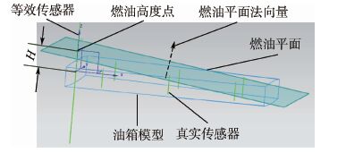 根据式(12),求出燃油平面与两根传感器交点的中点或者与一根传感器的有效交点,记为(xf,yf,zf),由该点和燃油平面法向量可得燃油平面方程为