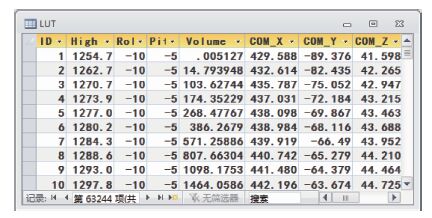 本文以3号油箱对应的燃油实体为例,即图 2中的Tank3_fuel.prt实体模型,等效传感器直线方向设置为 F s=(0,0,1),起始点坐标为(0,0,0),在不同姿态范围及步长下建立数据库,其数据规模如表 1所示。其中1号数据库划分最细,产生了63 244个表项,其数据表部分表项 如图 6所示。每一表项依次为编号(ID)、等效传感器高度(High)、燃油平面滚转角Φf(Roll)、燃油平面俯仰角θf(Pitch)、燃油体积(Volume)、燃油质心位置坐标(COM_X,COM_Y,COM_Z);在传统多个特性表方法下,若有三根传感器,则表项数为:3(表数)×21(Φf范围)×26(θf范围)×100(H个数)=163 800项,比本文的数据库规模大了一倍不止,可见等效传感器方法对多根传感器具有较好的数据压缩融合特性。