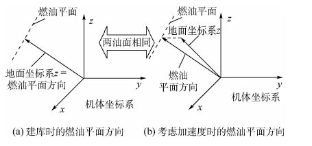 设加速度为(ax,ay,az),重力加速度为(0,0,-g),则可知在地面坐标系下,燃油平面法向量为