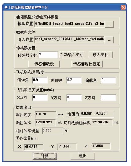 本文以3号油箱对应的燃油实体为例,利用表 1的1号数据库进行燃油体积解算,其界面如图 8所示。首先导入燃油实体模型文件(.prt)和数据库文件(.mdb),然后通过设置实际传感器信