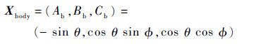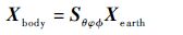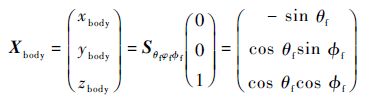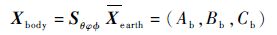 两个坐标系之间根据飞机姿态角可以相互转化,地面坐标系下的坐标 X earth=(xe,ye,ze)向机体坐标系下坐标 X body=(xb,yb,zb)转化的公式为