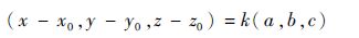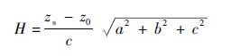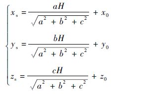 对图 2所示的油箱实体模型建立燃油质量特性表格,表征燃油平面位置的3个参数为燃油高度H、燃油平面滚转角Φf、燃油平面俯仰角θf。此处引入等效传感器来表征燃油高度值。等效传感器是在机体坐标系内设置一根直线,其长度及安装位置不受油箱外形的限制。根据燃油平面所在的平面与此直线的交点来确定燃油高度,其值定义为交点与传感器上一固定起始点的距离,如图 3所示。设等效传感器直线方向为 F s=(a,b,c),起始点坐标为(x0,y0,z0),燃油高度H定义为交点(xs,ys,zs)到起始点的距离,与直线方向 F s同向时燃油高度为正,反之为负,直线方程如式(3)所示,k为实数: